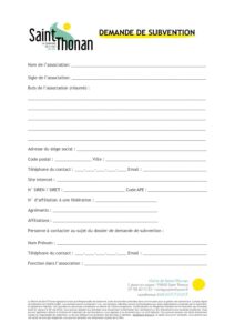 Vous êtes une association et vous souhaitez faire une demande de subvention auprès de la mairie de Saint-Thonan ? Vous pouvez télécharger ci-dessous le dossier de demande de subvention :