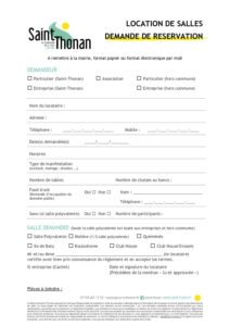 - Pour la réservation d’une salle, il est nécessaire d’effectuer au minimum 1 mois avant l’organisation de votre événement.